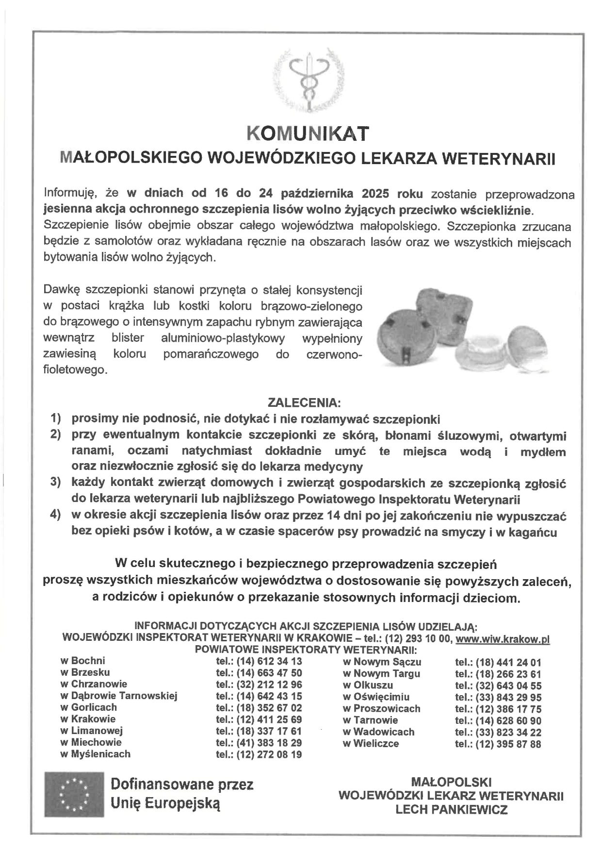 W dniach od 16 do 24 października 2025 roku zostanie przeprowadzona jesienna akcja ochronnego szczepienia lisów wolno żyjących przeciwko wściekliźnie.