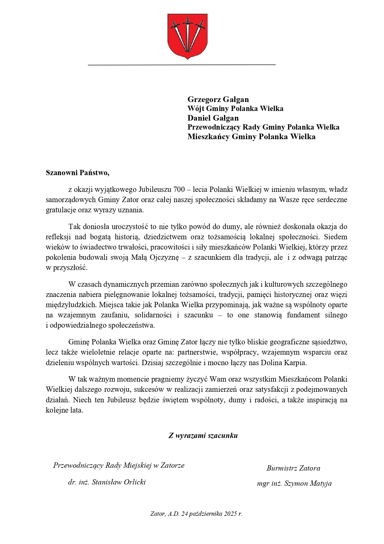 Życzenia z okazji 700-lecia Polanki Wielkiej