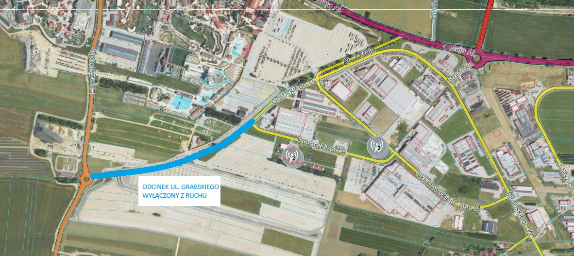 W tym okresie ruch pojazdów będzie kierowany na drogę wewnętrzną (ulicę równoległą do ul. W. Grabskiego), należącą do Sp.k Energylandia. Objazd zostanie odpowiednio oznakowany.
