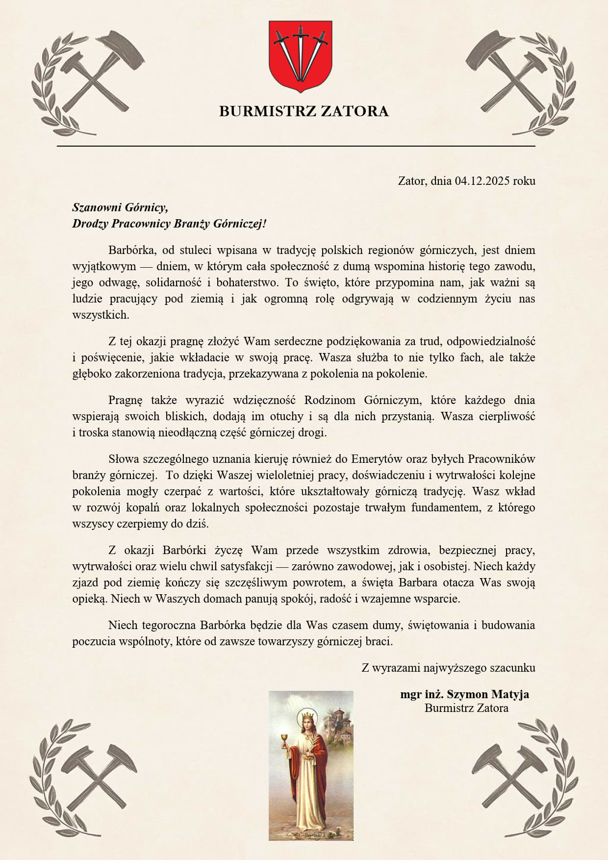 Życzenia Burmistrza Zatora dla Pracowników Branży Górniczej