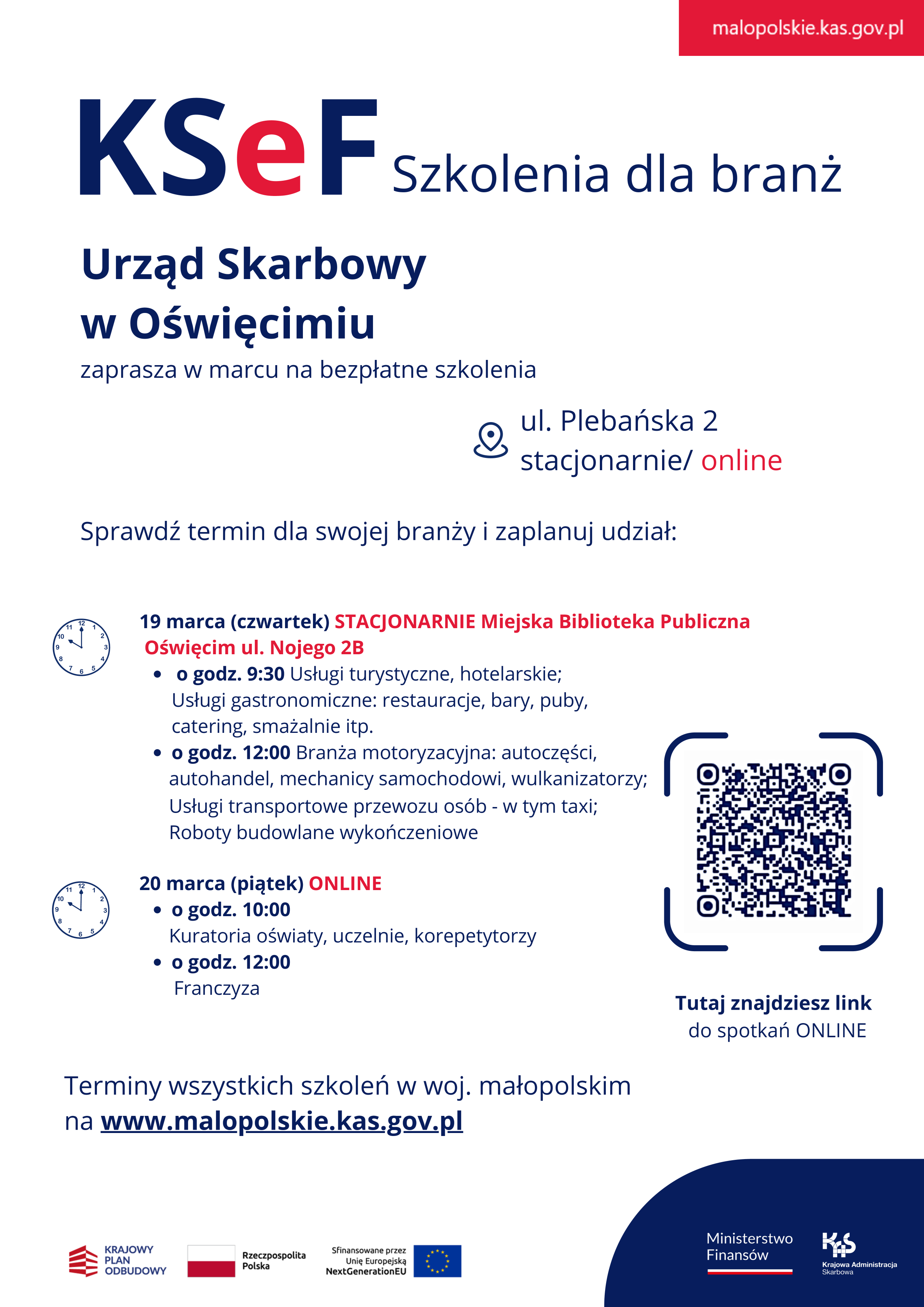 Urząd Skarbowy w Oświęcimiu zaprasza w marcu na bezpłatne szkolenia ul. Plebańska 2 stacjonarnie/ online Sprawdź termin dla swojej branży i zaplanuj udział