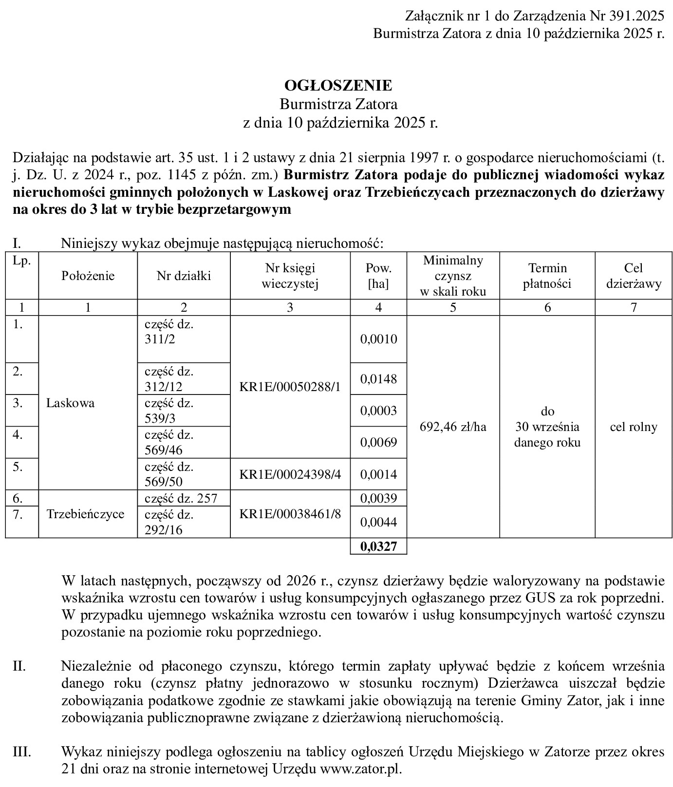OGŁOSZENIE Burmistrza Zatora z dnia 10 października 2025 r. - wykaz nieruchomości gminnych położonych w Laskowej oraz Trzebieńczycach przeznaczonych do dzierżawy