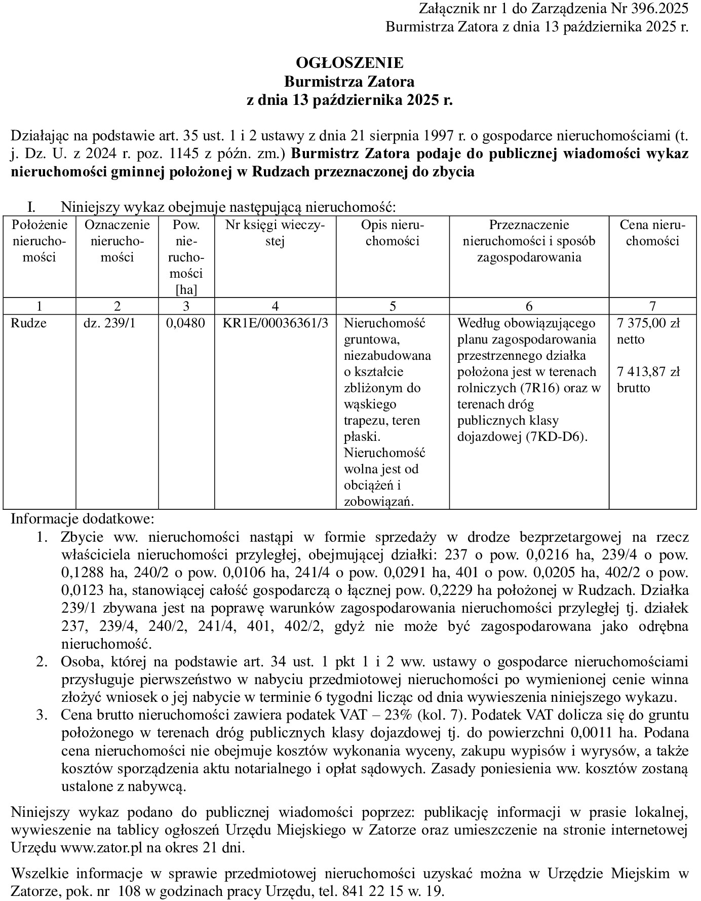 OGŁOSZENIE Burmistrza Zatora z dnia 13 października 2025 r. - wykaz nieruchomości gminnej położonej w Rudzach, oznaczonej jako dz. 239/1, przeznaczonej zbycia.