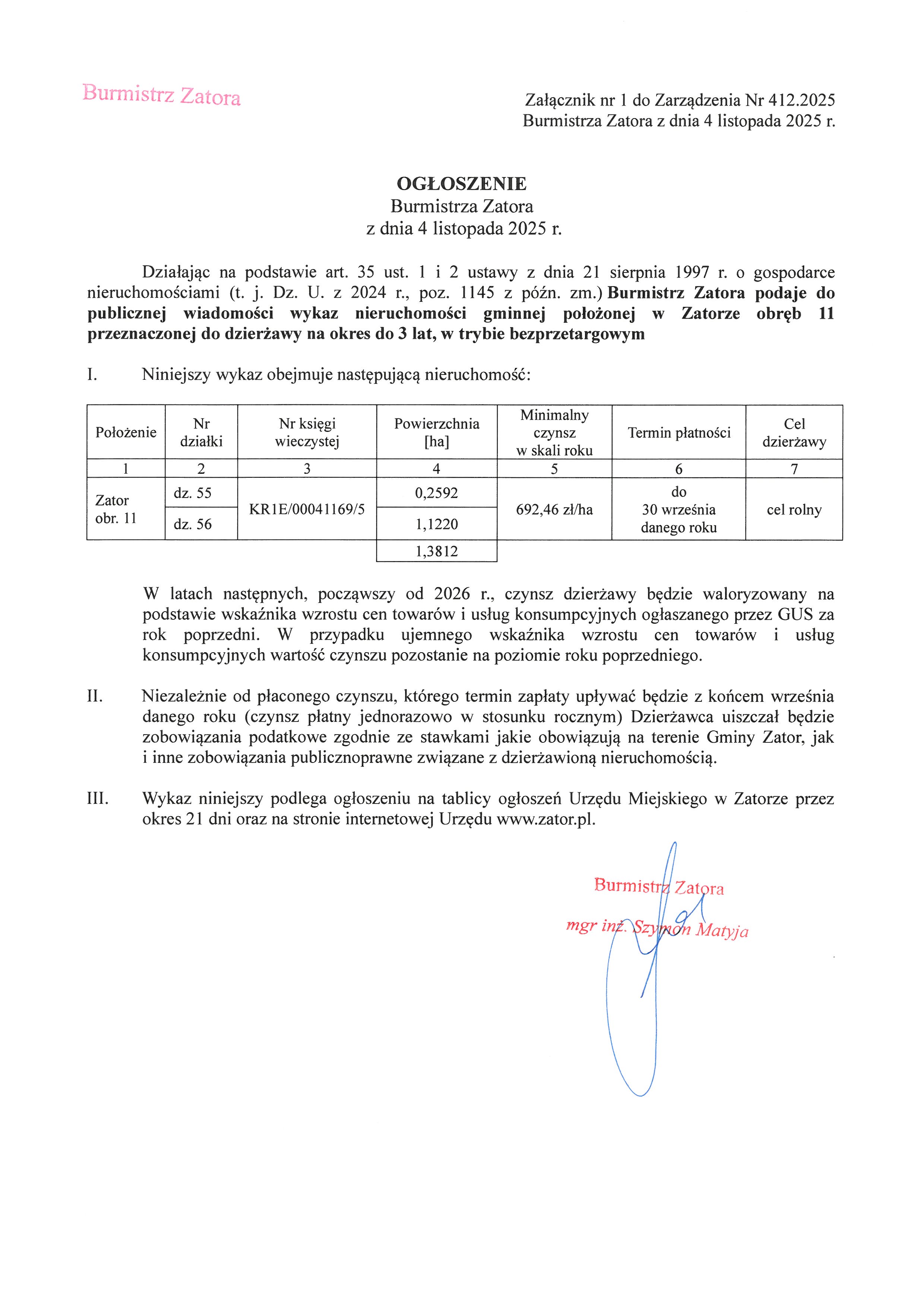 OGŁOSZENIE Burmistrza Zatora z dnia 4 listopada 2025 r. - wykaz nieruchomości gminnej położonej w Zatorze obręb 11 przeznaczonej do dzierżawy
