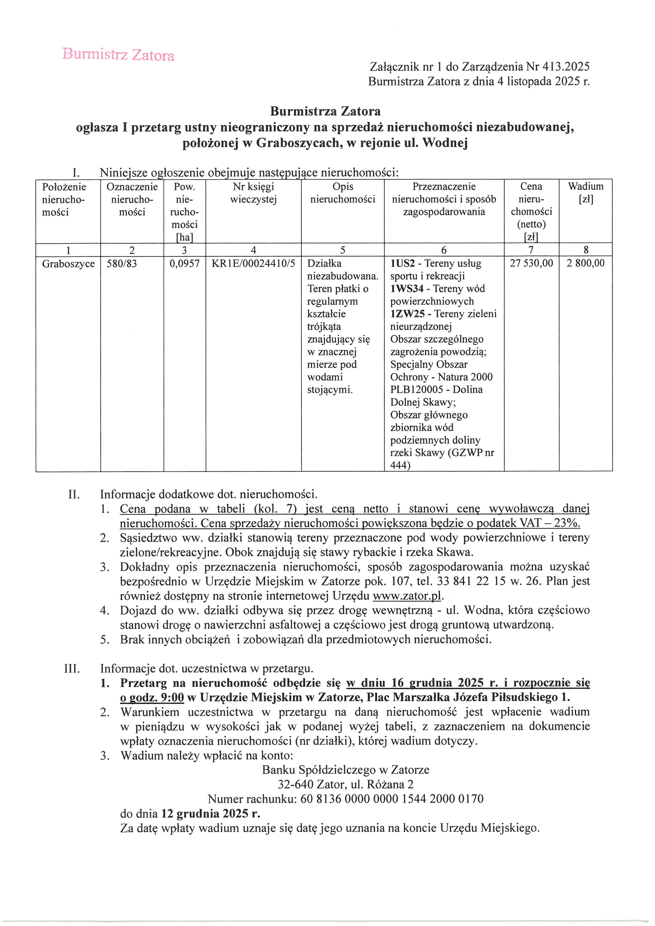 Ogłoszenie I przetargu ustnego nieograniczonego na sprzedaż nieruchomości niezabudowanej, położonej w Graboszycach, w rejonie ul. Wodnej