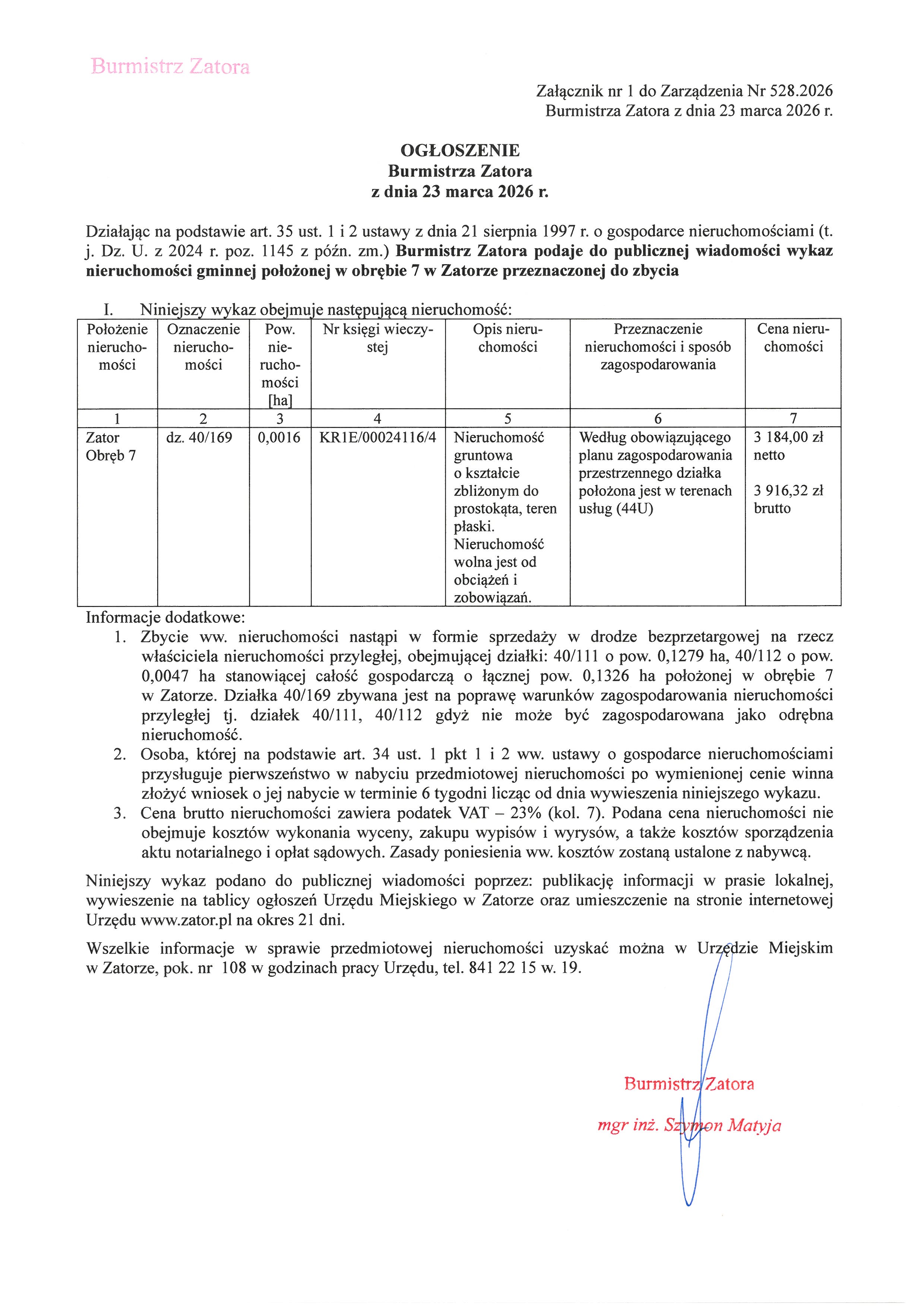 Ogłoszenie Burmistrza Zatora z dnia 23 marca 2026 r. - wykaz nieruchomości gminnej położonej w obrębie 7 w Zatorze, oznaczonej jako dz. 40/169, przeznaczonej zbycia.