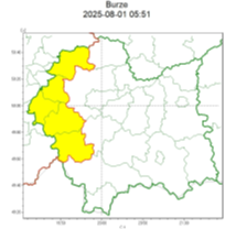 SMS IMGW-PIB OSTRZEGA: BURZE/1 małopolskie (5 powiatów) od 14:00/01.08 do 21:00/01.08.2025 deszcz 30 mm, porywy 65 km/h, grad. Dotyczy powiatów: chrzanowski, olkuski, oświęcimski, suski i wadowicki.